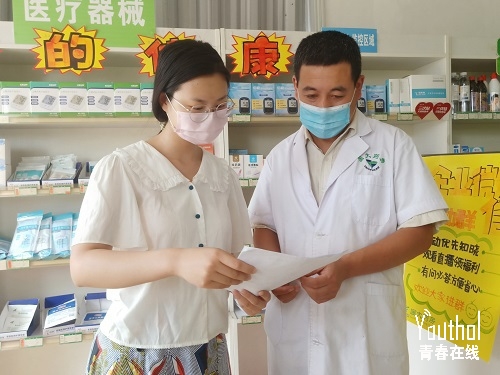 团队成员黄莉雯在临沂市沂南县花山路的零售药店进行走访调研。队员通过采访几家药店的主要负责人了解到,疫情期间,为避免人员密集,药店内设置隔离区、隔离带、隔离台,以非接触取药的方式减少人员接触。顾客进药店必须佩戴口罩,同时用额温枪测量体温。药店负责人还介绍,受疫情影响,药店的日均客流量明显下降,消费者多采取“线上购买”的方式进行购药,既解决群众用药问题,又降低感染病毒的危险系数。