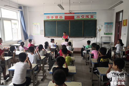 (据交通与车辆工程学院报道)7月22日下午,在德州市四女寺镇明德小学,爱之传承实践团队队长张硕邀请明德小学校长王建秀为同学讲述党的故事,线下实践团队成员以及学校同学共同聆听。