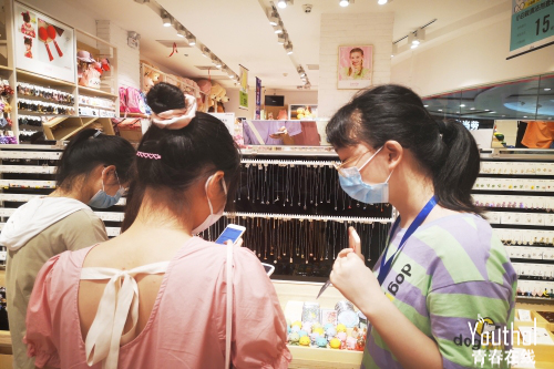 活动开始,调研分队五名同学分为两组,在万达广场各个楼层开展调研活动。队员主要驻扎在两个人流量较大的十字路口区域,借助“问卷星”平台将调查问卷制作成网页选填的模式,将链接的二维码印制在工作证背面,使市民手机扫码即可填写。为保证调研结果的客观性及普遍性,队员将受访者的年龄、是否拥有养宠经历等关键信息进行分门别类整理,完成实践团首次调研活动。