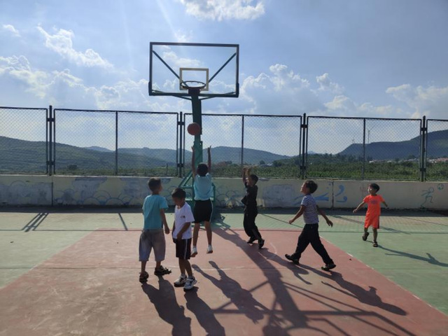 在篮球课程中,实践团成员们耐心地教授学生们基本的篮球技巧,如传球、投篮和防守等,并针对他们的动作进行指正分析。学生们积极参与,在学习中感受体育精神,展现了出色的潜力和团队精神。