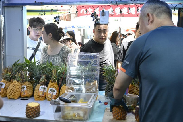 紧接着,团队成员进行菠萝冰制作与售卖,并与顾客进行妥善交流。同时团队成员热情为游客进行打卡拍照,并以此吸引大批游客。