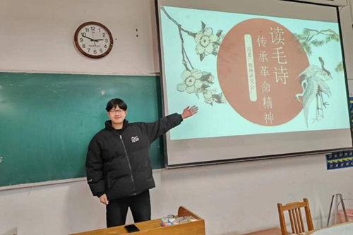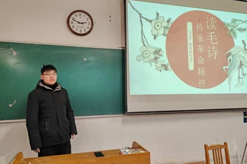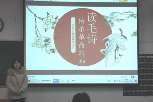 (据生命与医药学院报道)12月21日下午,生命与医药学院在十三号教学楼203室举办“读毛主席诗词,传承革命精神”诗词朗诵活动。本次活动由生命与医药学院冯思广精神学习研究会组织,部分学生参加。
