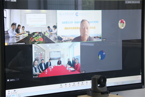 牛书田、刘桂莲分别代表两校签署共建汉语国际教学实习基地协议。双方进行线上合影,仪式圆满结束。