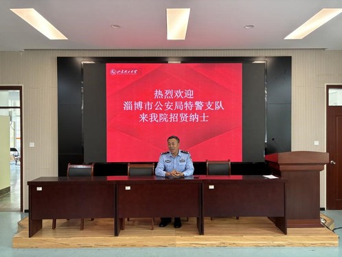 张砚杰首先对淄博市公安局特警支队现阶段人才需求结构、需具备的专业素质和岗位特色亮点进行详细介绍,他提到,特警队伍是一支素质好、水平高、专业强的精干队伍,来到学院进行人才交流,目的是为了选拔出一批怀揣特警情怀的优秀毕业生加入到队伍当中来,希望同学们踊跃报名,并在学院内部形成梯队力量,逐年向特警支队输送优秀毕业生。