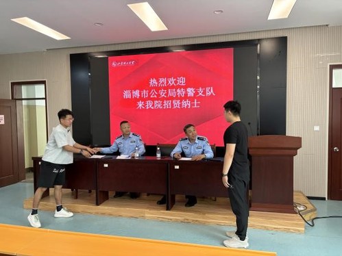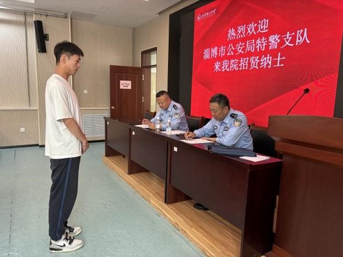 随后,淄博市公安局特警支队二大队大队长张砚杰和教导员黄洪岭对有意报名的毕业生进行现场面试。