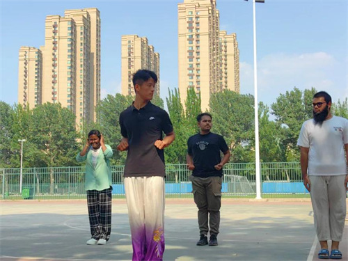 活动由体育学院宋著聪老师担任技术指导,武术协会的会员为留学生们展示了太极拳、查拳、翻子拳、螳螂拳等多种武术套路,精湛的武术技艺赢得了在场留学生的阵阵掌声,随后协会志愿者将留学生进行分组,经验丰富的会员们进行指导和陪练,他们耐心细致地向留学生们讲解武术的基本动作和技巧,并亲自示范,及时纠正技术动作,让留学生们能够更好地理解和掌握。在武协会员的指导下,留学生们纷纷投入到武术的练习中,虽然他们的动作还不够熟练,但每个人都充满了热情和干劲,认真学习领悟动作要领,不断地尝试、纠正、再尝试,力求将每个动作都做到最好。