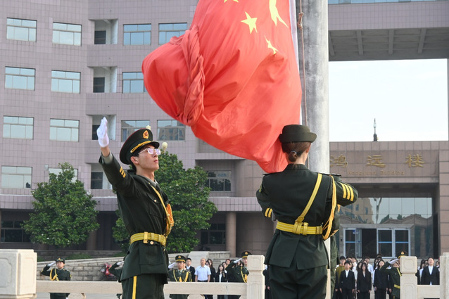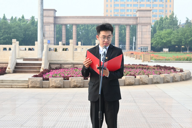 (据外国语学院报道)为加强爱国主义和社会主义核心价值观教育,引导外国语学院师生不忘初心、牢记使命,6月3日早上,外国语学院在鸿远楼前举行“踔厉奋发开新路,挺膺担当谱新篇”升旗仪式。外国语学院团委书记、学生工作办公室主任崔鹏、2023级辅导员邢琛、2023级和2022级全体学生参加,升旗仪式由英语2301班陈公仆主持。