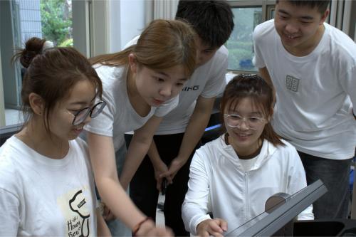 首先,实践团成员在老师的指引下来到多功能媒体教室参观,在教室里,实践团成员被智慧课桌吸引,在课桌背面有一个液晶显示屏,学生们可以在显示屏上观看教学视频,查找生物模型,这一新教学模式极大促进了青少年的学习兴趣。实践团成员在显示屏上观看了人类眼睛的模型,更加了解眼睛工作的结构图。