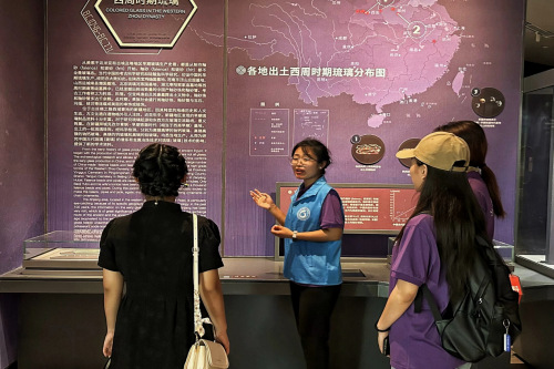 实践团成员在活动开始前查阅了大量的相关资料,将理论知识与实际展品结合开展了志愿讲解服务。成员们在讲解过程中结合馆内的“数字化云端展览台”向游客讲解陶琉文化的内涵,不仅注重历史的准确性,还综合考虑了游客的接受程度,用通俗易懂的语言和生动准确的比喻,让游客更深入地了解陶琉文化。通过提供高水平的志愿讲解服务,帮助参观者了解、明晰展厅内容,拥有更好的观览体验。