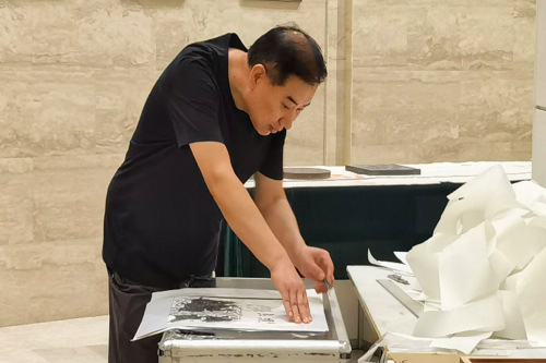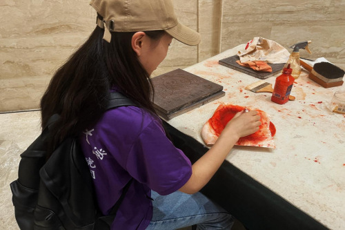 除此之外,实践团成员来到了石刻拓印研学体验中心,了解石刻的历史故事和传统拓印技艺。石刻非遗文化传承人为实践团成员介绍了石刻制作所需的工具和材料,并在制作过程中细致讲解了如何使用这些工具,成员们认真学习每个步骤,并在传承人的教授下体验拓片制作,体会到石刻艺术的独特魅力。