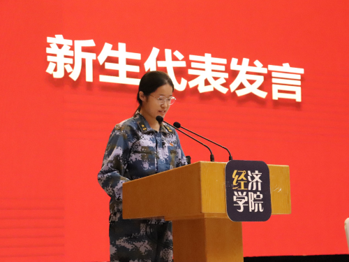 研究生在校生代表、经济硕2402班王浩分享了自己从本科到研究生阶段参与科创、实践的收获与感悟,鼓励新同学努力奋进,共同书写经济学子的精彩篇章。本科生在校生代表、经济2303班孔文喆向新生同学提出三点建议,倡导同学们明确目标,握紧人生“方向盘”;全面发展,书写成长“多重奏”;接续奋斗,积蓄远航“动力源”。新生代表、国贸2502班牟洪颖表达了自己对大学及所学专业的憧憬与热爱,承诺将潜心求学、知行合一、胸怀家国,勇做时代的弄潮儿。
