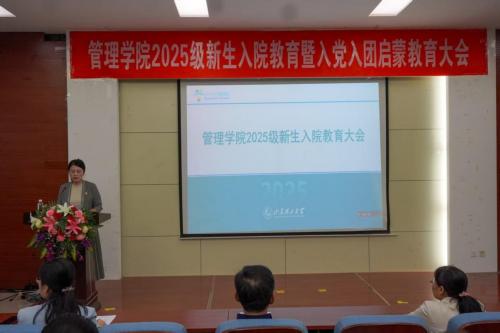 (据管理学院报道)9月28日下午,我院2025级新生入院教育暨党团启蒙大会在4号教学楼报告厅隆重举行。学院党委书记杨直、党委副书记兼院长孙秀梅、副院长白福萍、宋剑锋、学生工作办公室主任兼团委书记李璐、2025级全体班主任及新生参加大会。大会由学院党委副书记张佳主持。
