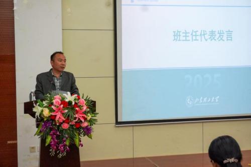 紧接着,班主任代表刘辉老师发言,内容围绕大学学习的特点与方式、专业能力的培养路径、管理思维的实际应用等维度,向新生阐述了大学学习的要义。他勉励同学们要主动探索,善用学校资源,注重跨学科学习,努力成长为懂专业、会实践、有视野的管院人。